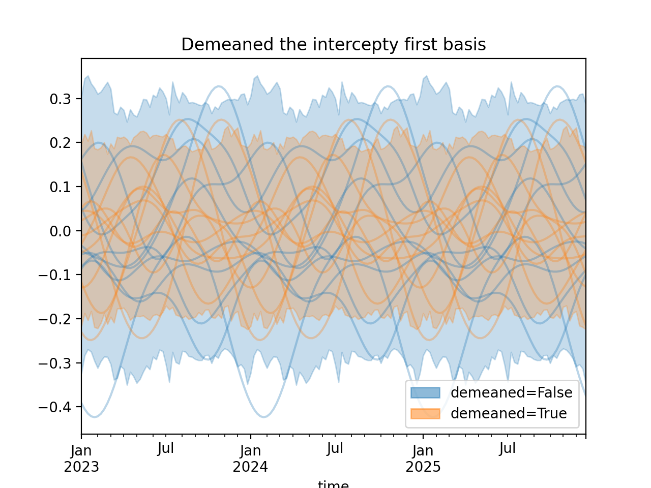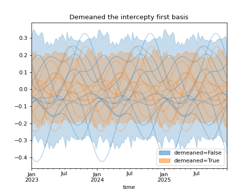 import numpy as np import pandas as pd import xarray as xr import matplotlib.pyplot as plt from pymc_marketing.mmm import HSGPPeriodic from pymc_marketing.plot import plot_curve seed = sum(map(ord, "Periodic GP")) rng = np.random.default_rng(seed) scale = 0.25 ls = 1 kwargs = dict(ls=ls, scale=scale, period=52, cov_func="periodic", dims="time", m=20) n = 52 * 3 dates = pd.date_range("2023-01-01", periods=n, freq="W-MON") X = np.arange(n) coords = {"time": dates} hsgp = HSGPPeriodic(demeaned_basis=False, **kwargs).register_data(X) hsgp_demeaned = HSGPPeriodic(demeaned_basis=True, **kwargs).register_data(X) def sample_curve(hsgp): return hsgp.sample_prior(coords=coords, random_seed=rng)["f"] non_demeaned = sample_curve(hsgp).rename("False") demeaned = sample_curve(hsgp_demeaned).rename("True") combined = xr.merge([non_demeaned, demeaned]).to_array("demeaned") _, axes = combined.pipe(plot_curve, "time", same_axes=True) axes[0].set(title="Demeaned the intercepty first basis") plt.show()