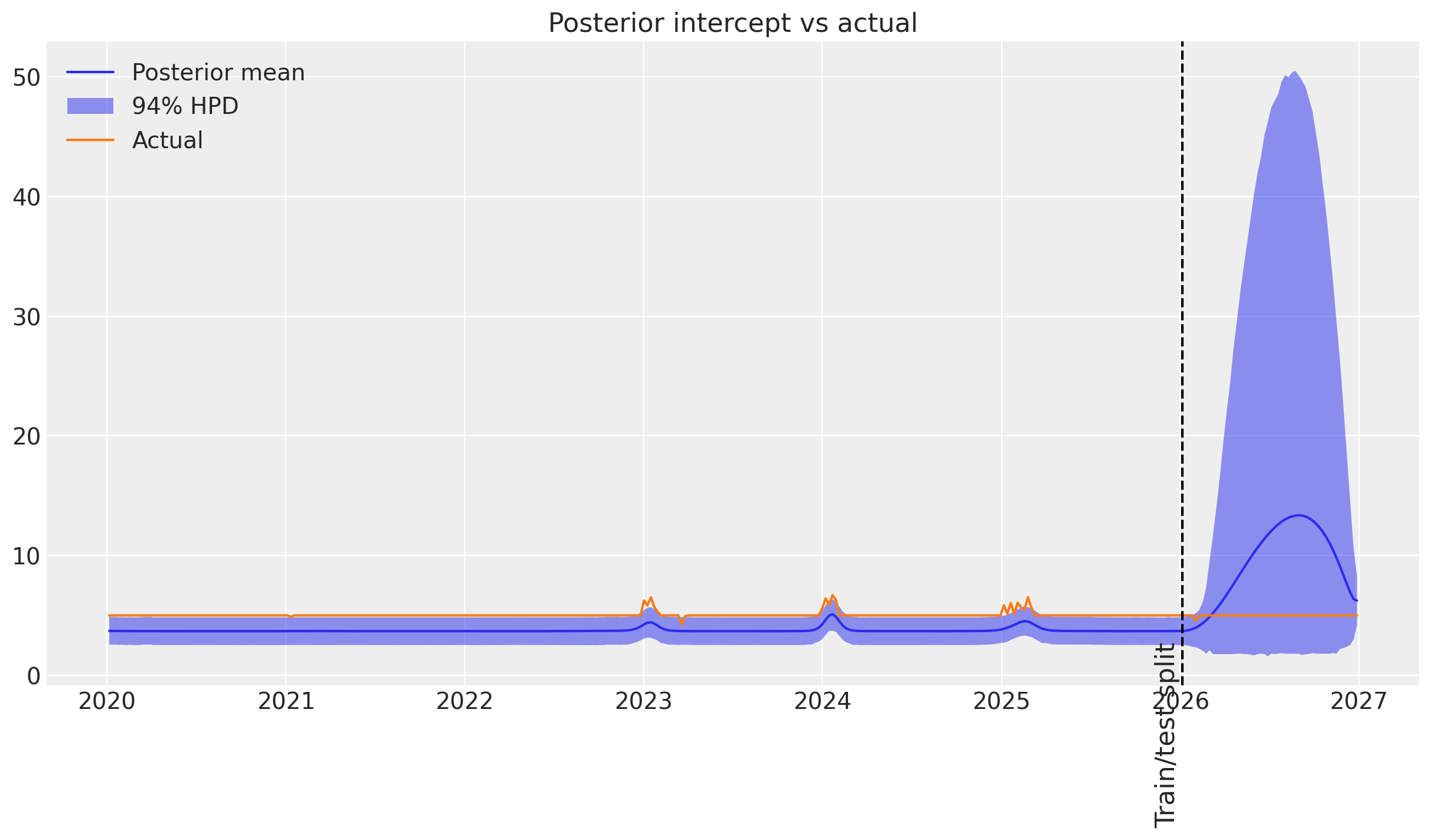 This is a strong indication that the time-varying intercept prior may not be well parameterized. Since the events that we synthesize happen on shorter time scales than the trends we modeled previously, it is likely that the mean of the length-scale prior is too high (default is two years).